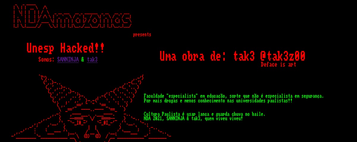 O deface foi assinado por "Sanninja" e "tak3". De acordo com o Defcon Lab, o NDA é um dos grupos mais ativos do país e realiza ataques do tipo desde 2019. Confira, abaixo, alguns dos resultados do ataque à página da Unesp, que por volta das 14h30 foi retirada do ar.